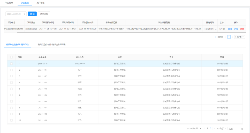 系統支持從活動發起、范圍設定(教師/學生)、在線投票到結果統計的全流程線上管理。后臺可清晰查看投票結果、參與情況與數據匯總,確保評選過程公開、公平、公正。